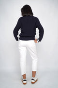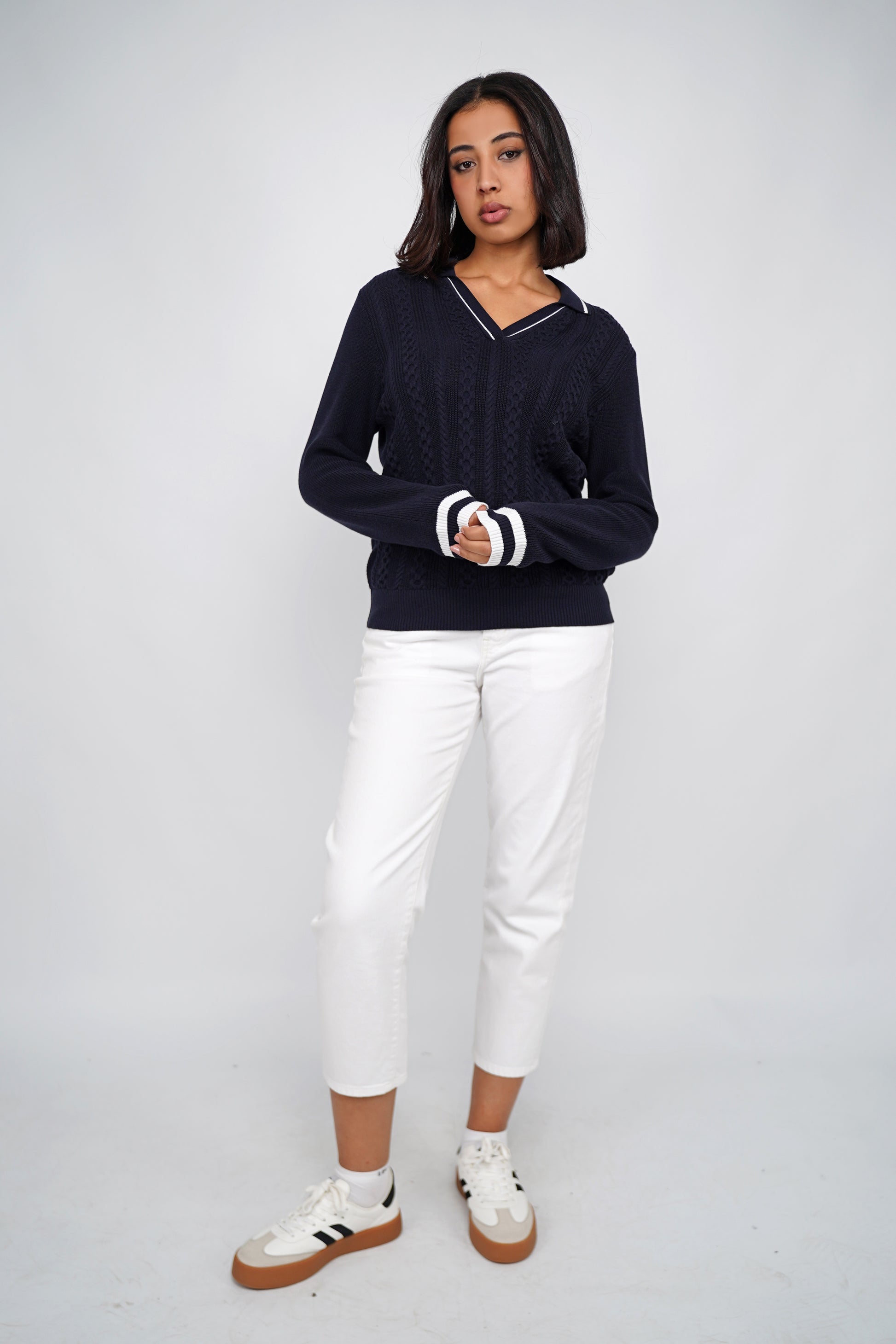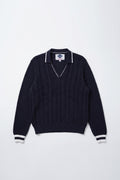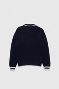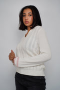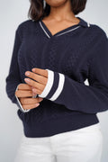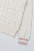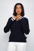 Un pull inspiré de l’esthétique preppy, revisité dans une maille douce et structurée. Son motif torsadé sur le devant apporte du relief et un esprit authentique, tandis que son col polo avec fines rayures contrastées ajoute une touche féminine et élégante. Les poignets soulignés de bandes colorées donnent une finition sportive très chic.