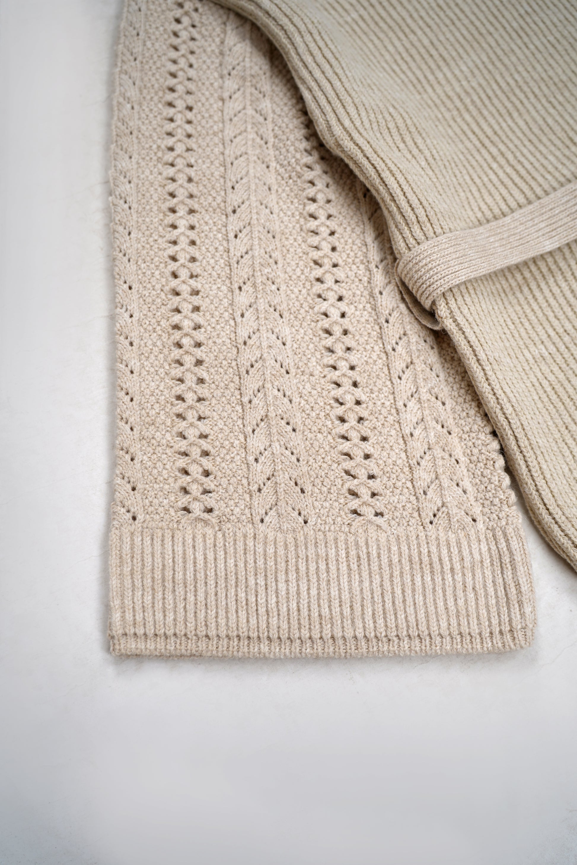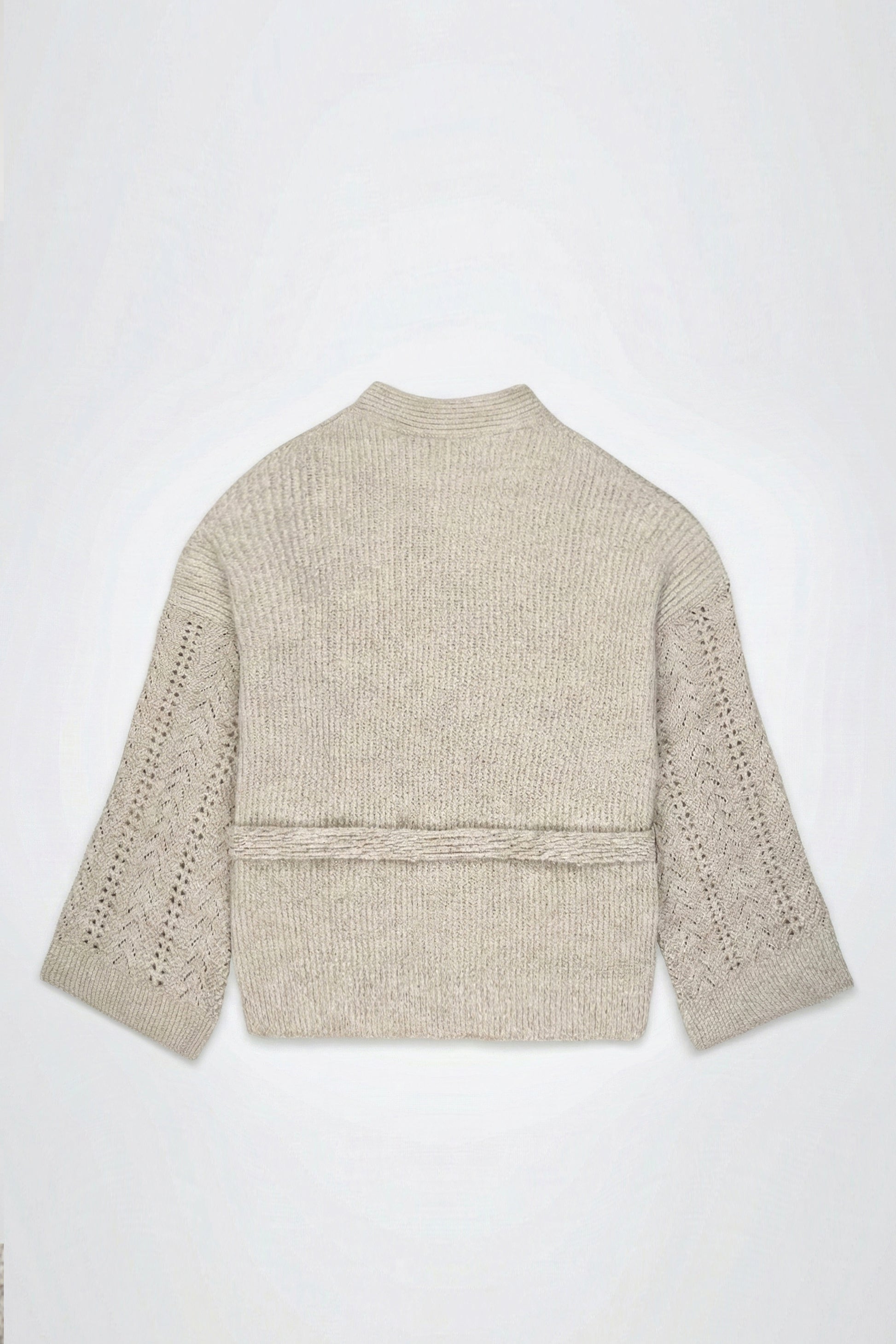 Le devant et le dos en maille côtelée apportent un tombé fluide, tandis que les manches ajourées au motif chevron ajoutent une touche féminine et raffinée.