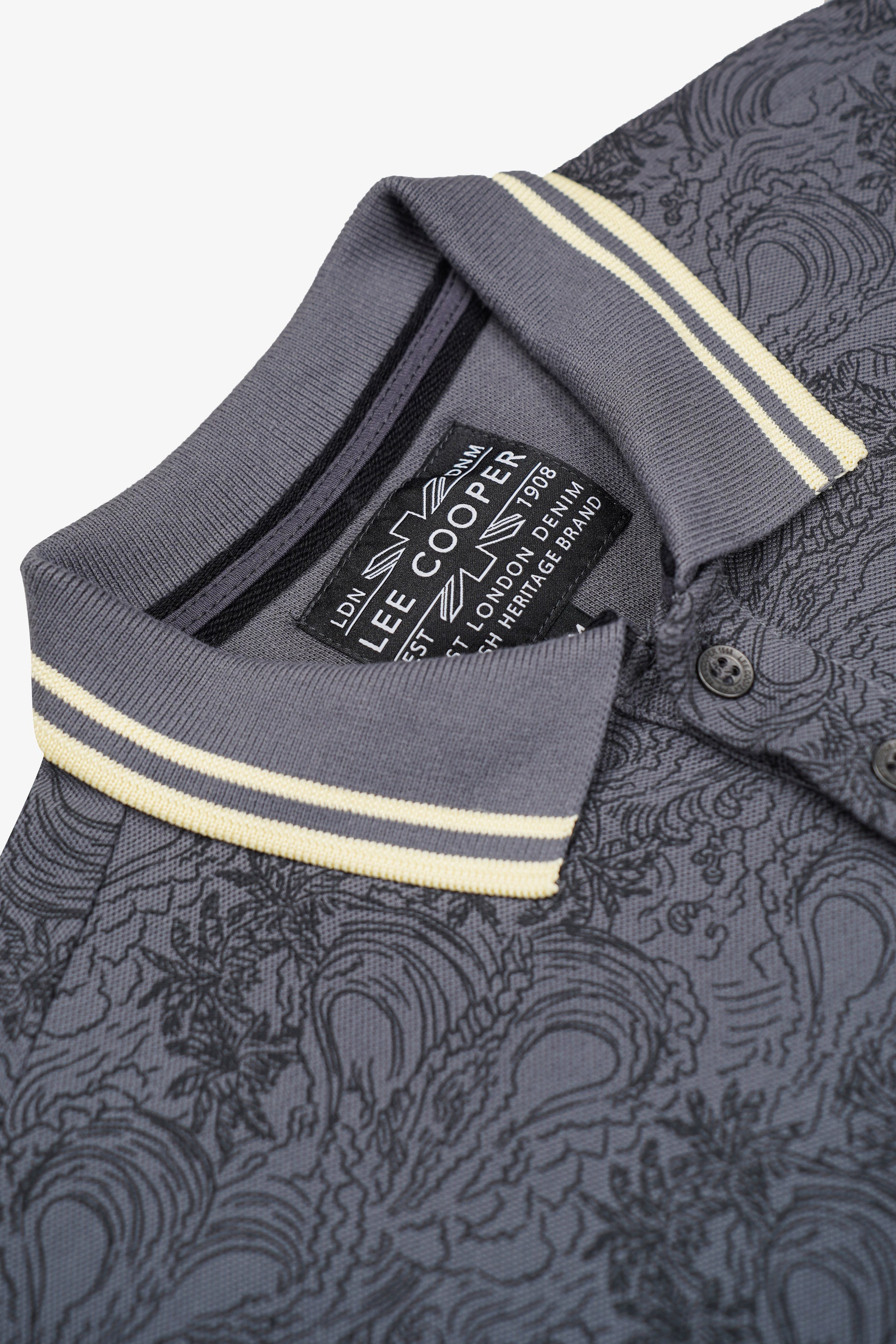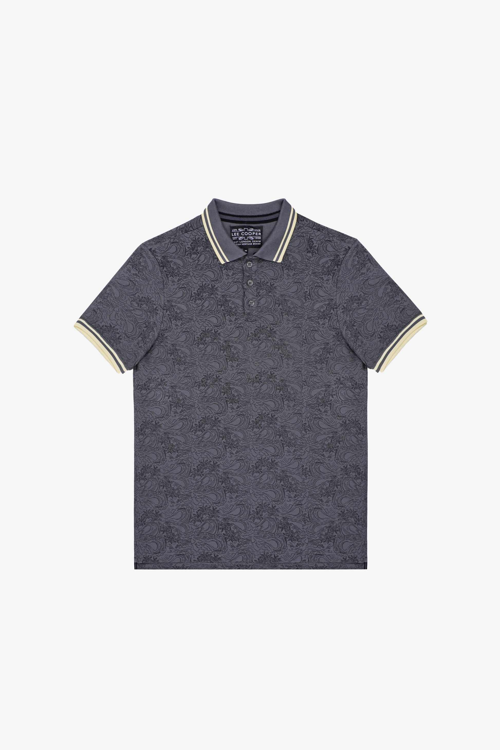 Ce polo se distingue par son imprimé intégral ton sur ton au motif inspiré des vagues et de la nature, pour un look original et sophistiqué. Réalisé en piqué 100% coton, il offre confort et respirabilité tout en conservant une allure urbaine. Les finitions contrastées crème au col et aux manches apportent une touche d’élégance britannique typique de Lee Cooper.